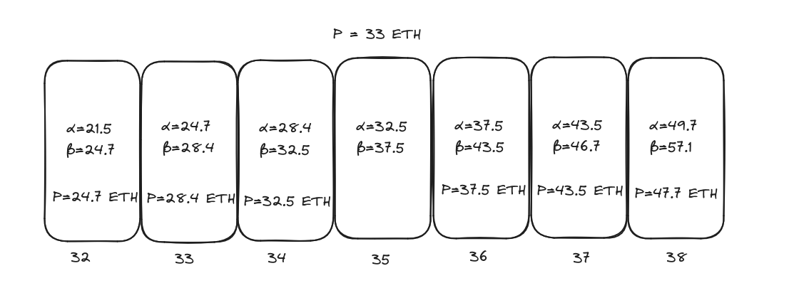 In the figure above, α denotes a pool's lower bound, β denotes its upper bound, and P is the initial mark price of the NFT, currently set to 33 ETH. As 33 lies between 32.5 and 37.5, its active pool is Pool 35.